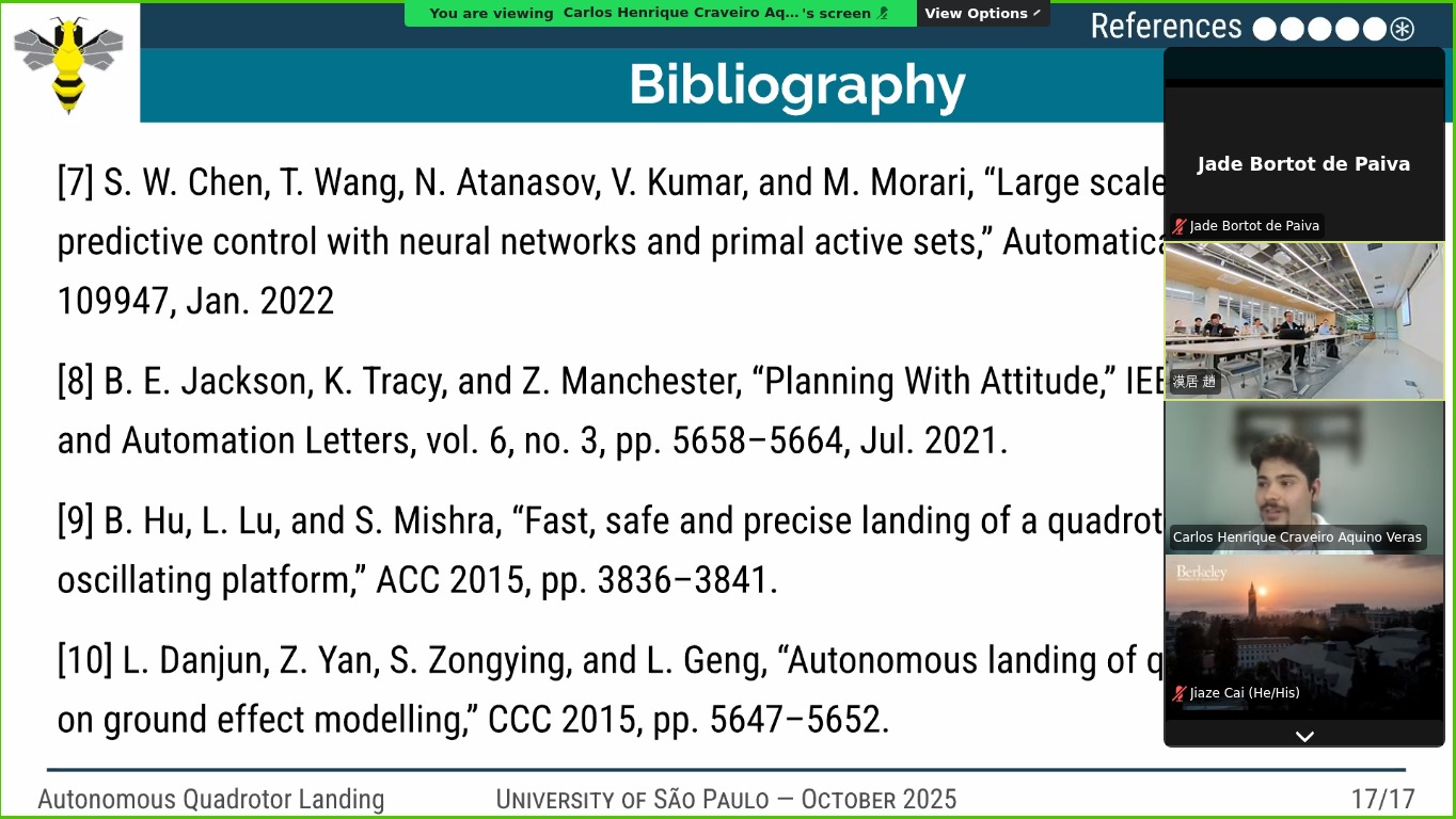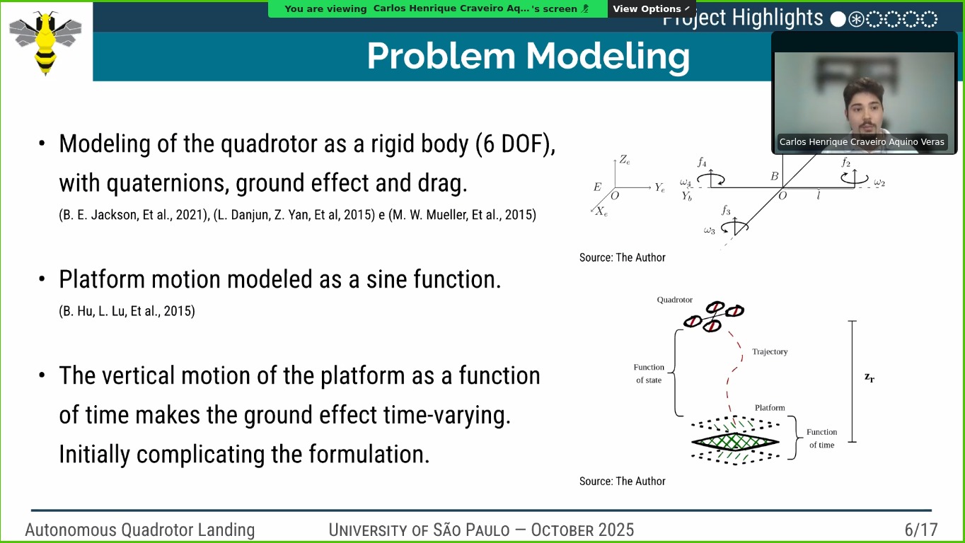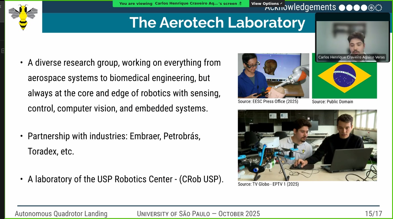 A apresentação de Carlos, intitulada Autonomous Quadrotor Landing on Ship-Borne Oscillating Platforms, abordou estratégias de controle para permitir o pouso autônomo e seguro de veículos aéreos não tripulados do tipo quadrirrotor em plataformas móveis sujeitas a oscilações, como o convés de um navio no mar. O trabalho é derivado de seu projeto de Iniciação Científica, desenvolvido no Aerotech Lab da EESC sob orientação do professor titular Glauco Augusto de Paula Caurin, do Departamento de Engenharia Aeronáutica. O projeto é financiado pela Fundação de Amparo à Pesquisa do Estado de São Paulo (Fapesp) como bolsa de Iniciação Científica, com foco em controle preditivo aplicado a pousos em plataformas oscilantes (None).