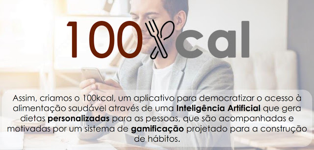 Objetivos: o objetivo do 100kcal é democratizar a alimentação saudável no Brasil, através de uma inteligência artificial que gera dietas personalizadas automaticamente para as pessoas, e utiliza técnicas de psicologia comportamental e gamificação para a criação e manutenção de hábitos.