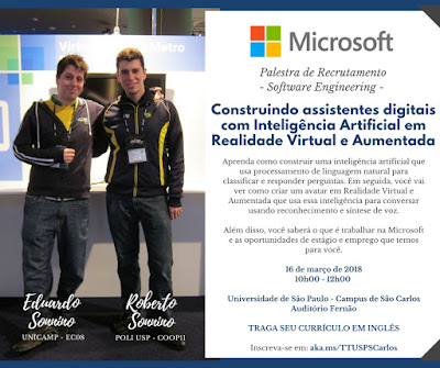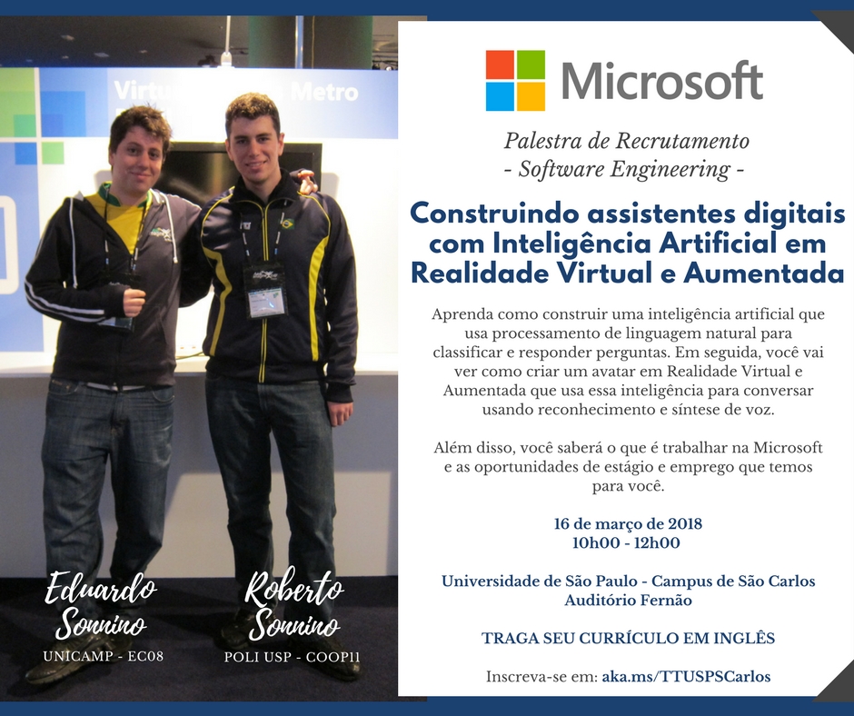 Os irmãos mostrarão, ainda, como criar um avatar em realidade virtual e aumentada, que será capaz de conversar, via assistente digital, usando técnicas de reconhecimento e síntese de voz. Para participar do bate-papo, é preciso efetuar a inscrição previamente por meio deste link: aka.ms/TTUSPSCarlos. Há 200 vagas disponíveis. O evento ocorrerá no auditório Fernão Stella de Rodrigues Germano do Instituto. Os palestrantes também falarão sobre as oportunidades de estágio e emprego oferecidas pela Microsoft e pedem aos estudantes interessados que tragam seus currículos em inglês.