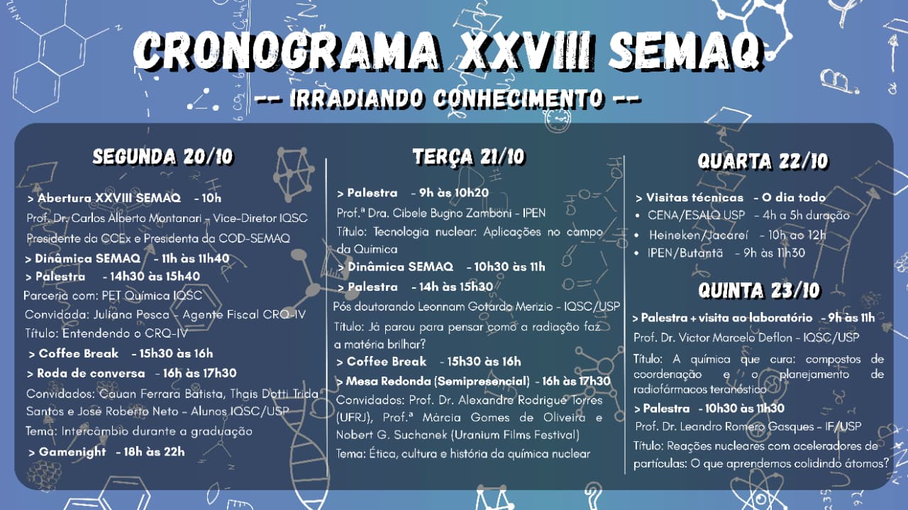 Além das palestras, mesas redondas e minicursos, que serão conduzidos por especialistas, haverá visita a laboratório de pesquisa do IQSC e visitas técnicas externas. Para descontrair, serão realizadas dinâmicas SEMAQ e uma sessão noturna de cinema.