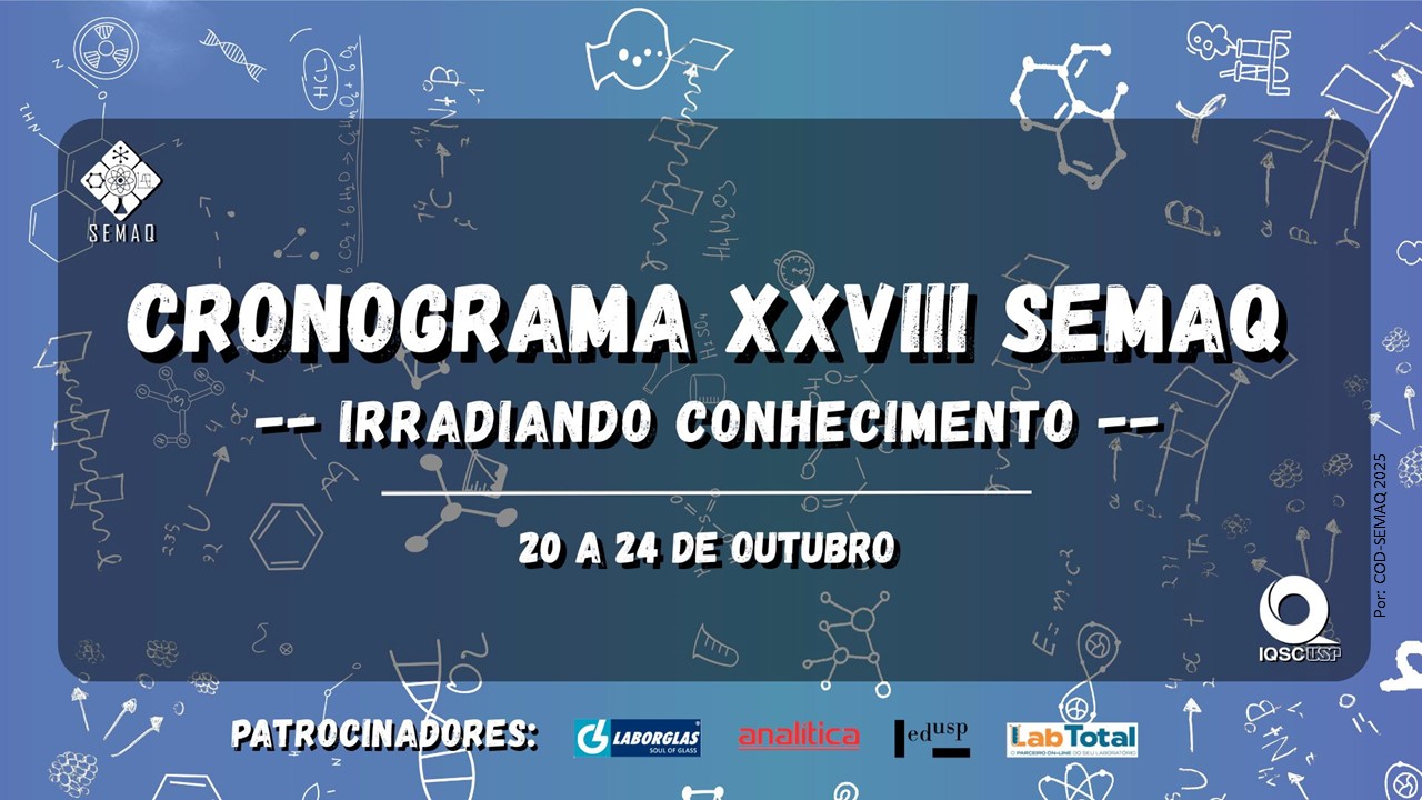 Entre os dias 20 e 24 de outubro de 2025, o Instituto de Química de São Carlos (IQSC/USP) realiza a XXVIII Semana de Química “Prof. Edson Rodrigues” (SEMAQ).